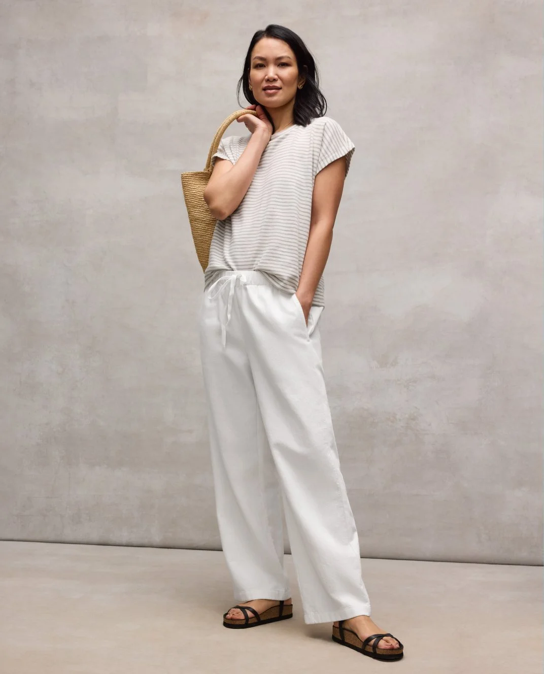 Organic Cotton Stretch Rib Scoop Neck Tank, S6XJU-U4395M, White, $88.Slubby Organic Cotton Linen Straight Pant, S6GBG-P4914M, White, $188. Fair Trade Certified™.