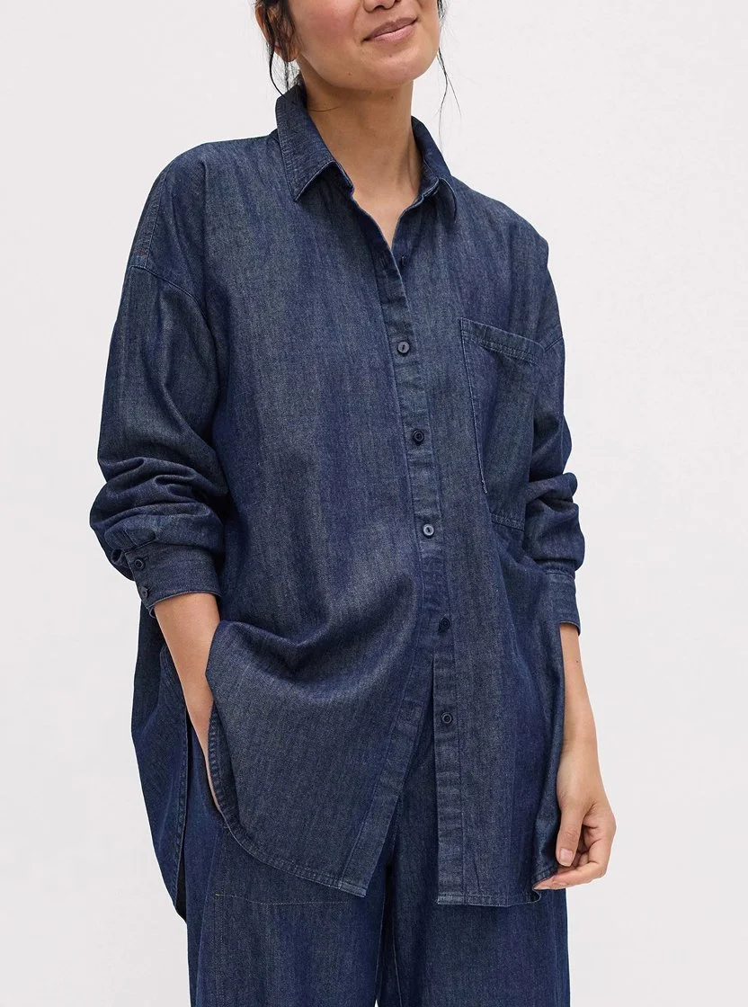 Lightweight Organic Cotton Denim Classic Collar Long Shirt, S6TUP-T6268M, Dark Indigo, $178.